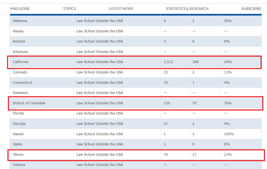 매년 NCBE에서 외국인 시험합격률을 정리해주고 있습니다. 아래 표를 보면 일리노이바 합격률이 캘바 합격률보다 낮은 것을 볼 수 있습니다.